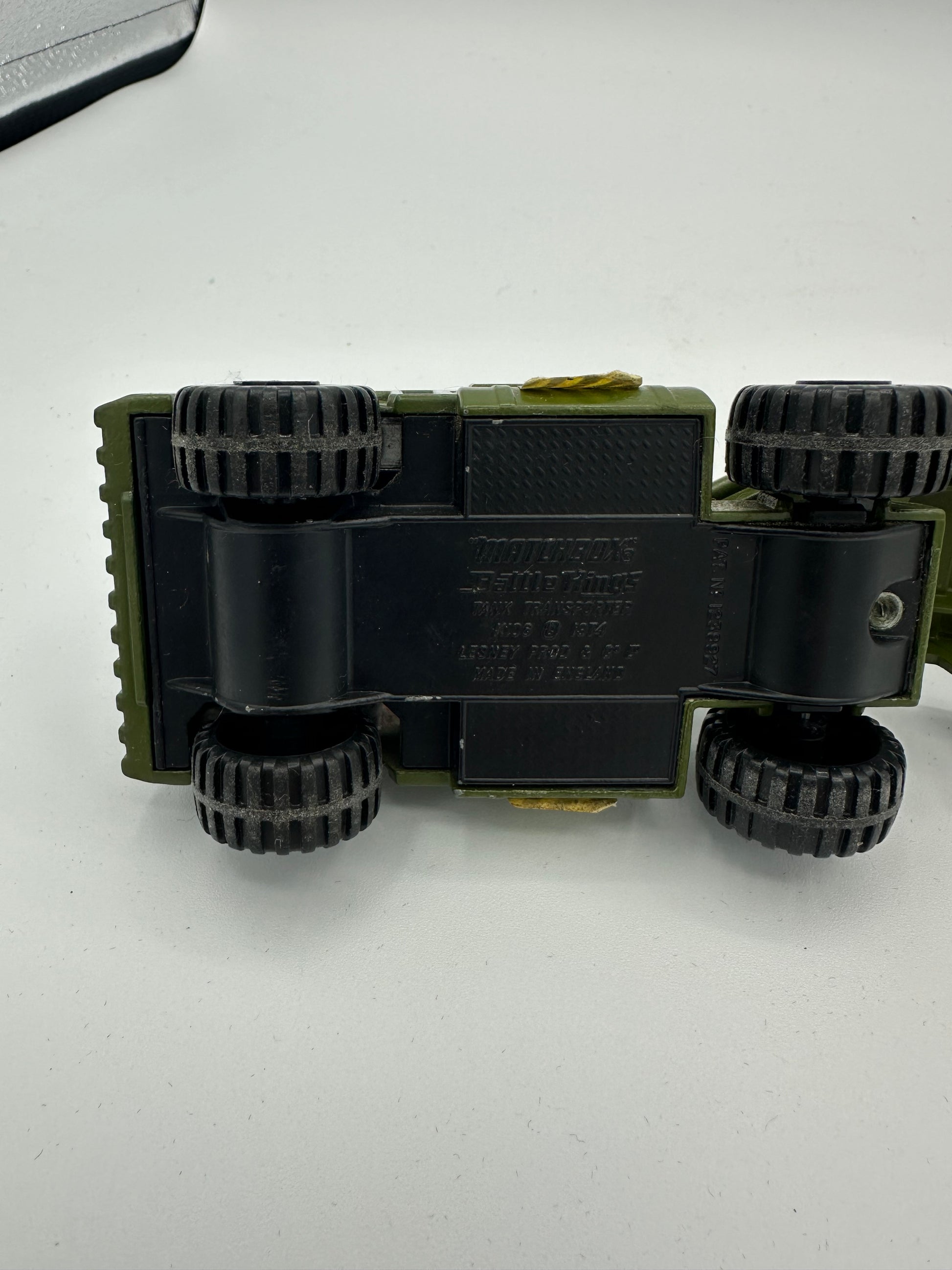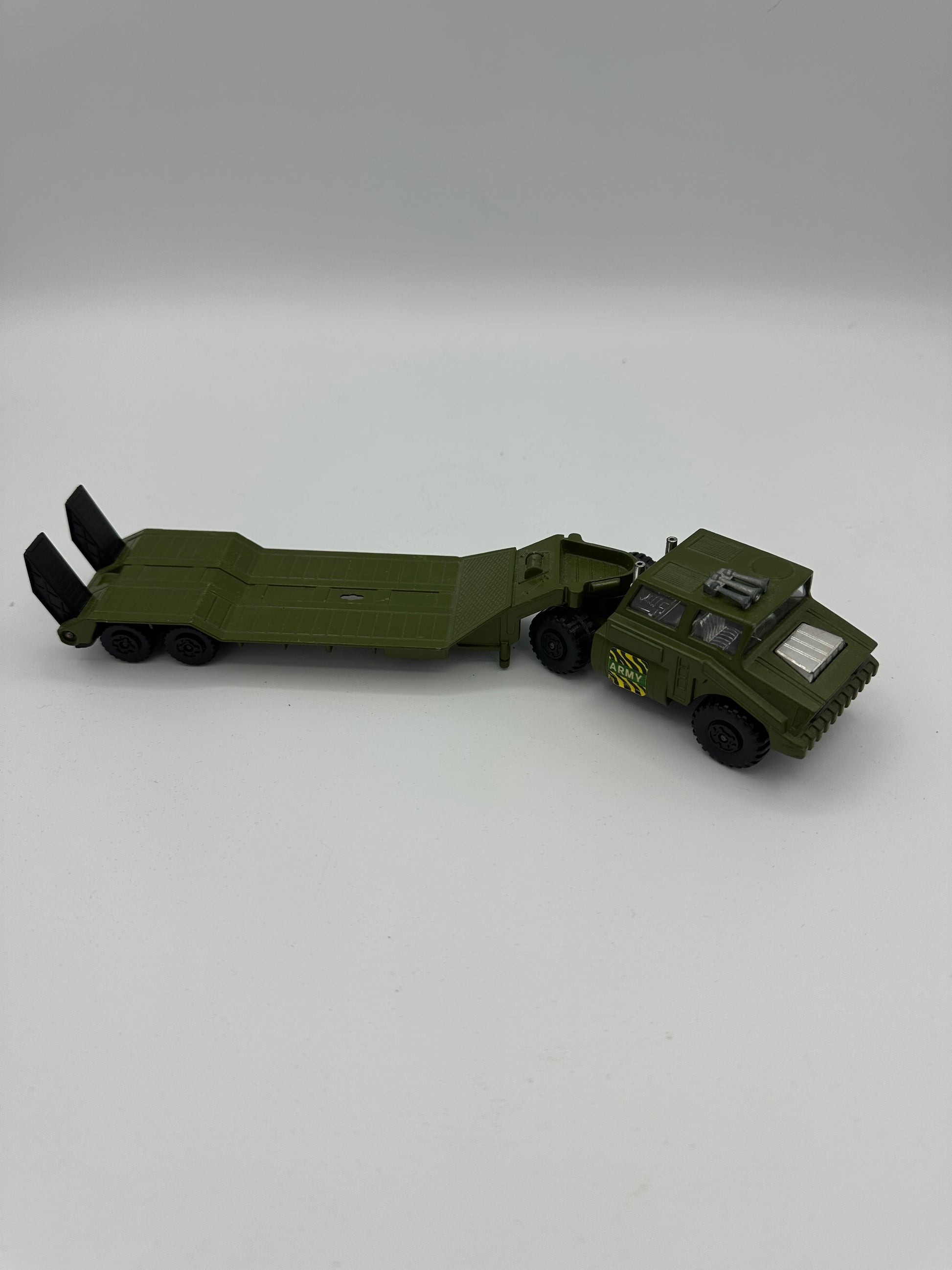 Camion militare matchbox 1974. Realizzato in plastica resistente, composto da una motrice e un lungo rimorchio a pianale ribassato, rifinito da un colore verde militare opaco.